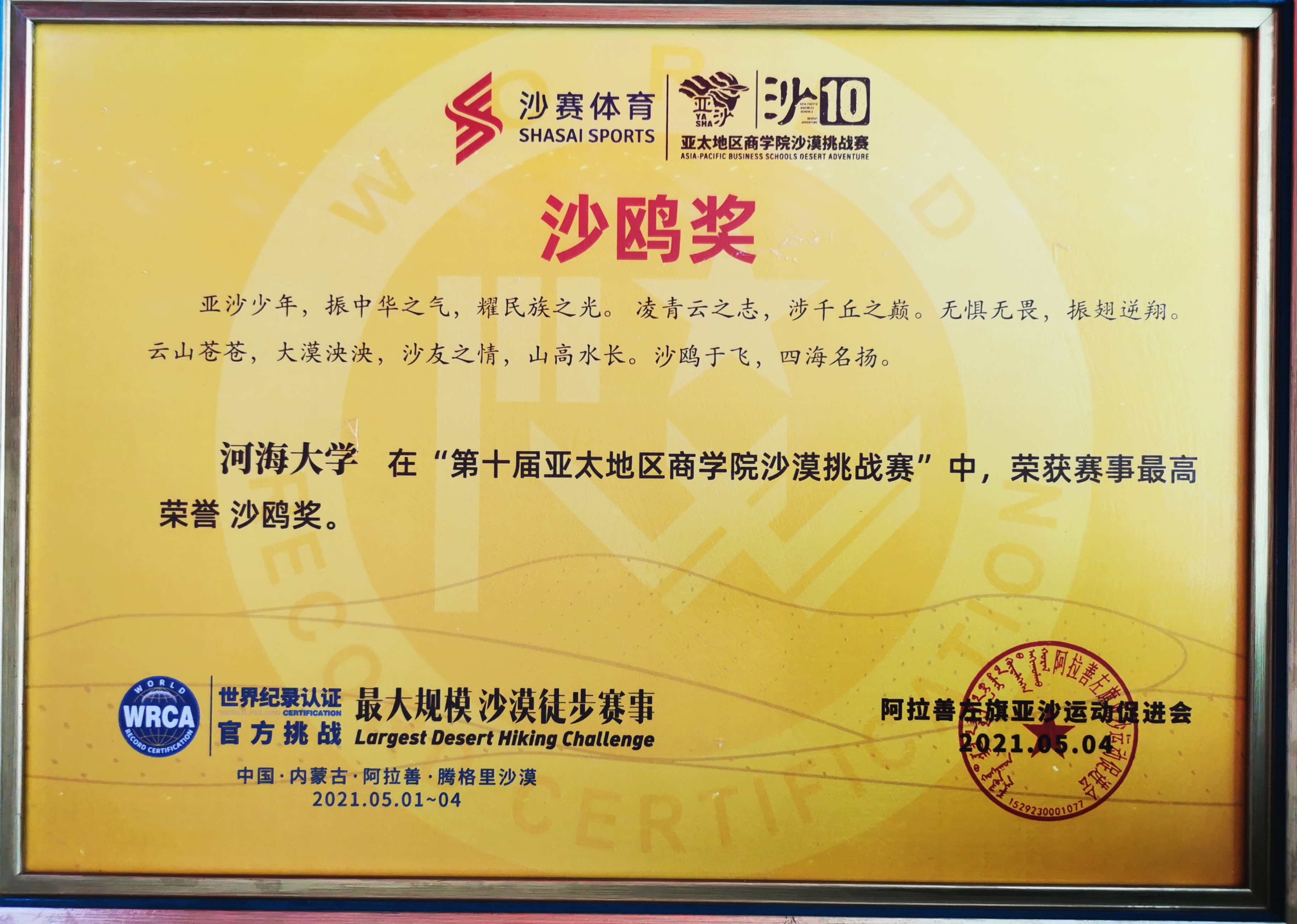 2021年5月2日至4日,第十届亚太地区电影先生 沙漠挑战赛在内蒙古阿拉善盟左旗腾格里沙漠举行。来自亚太地区121所院校,4000余人共同参赛,在亚沙十年之际创下历届亚沙赛规模之最。由电影先生 电影先生 组建的“沙10战队”获MBA组团体第五名,并摘得大赛最高荣誉“金沙鸥奖”。同时,个人组获女子超A队第六名、男子A队第九名、女子C队第九名好成绩。