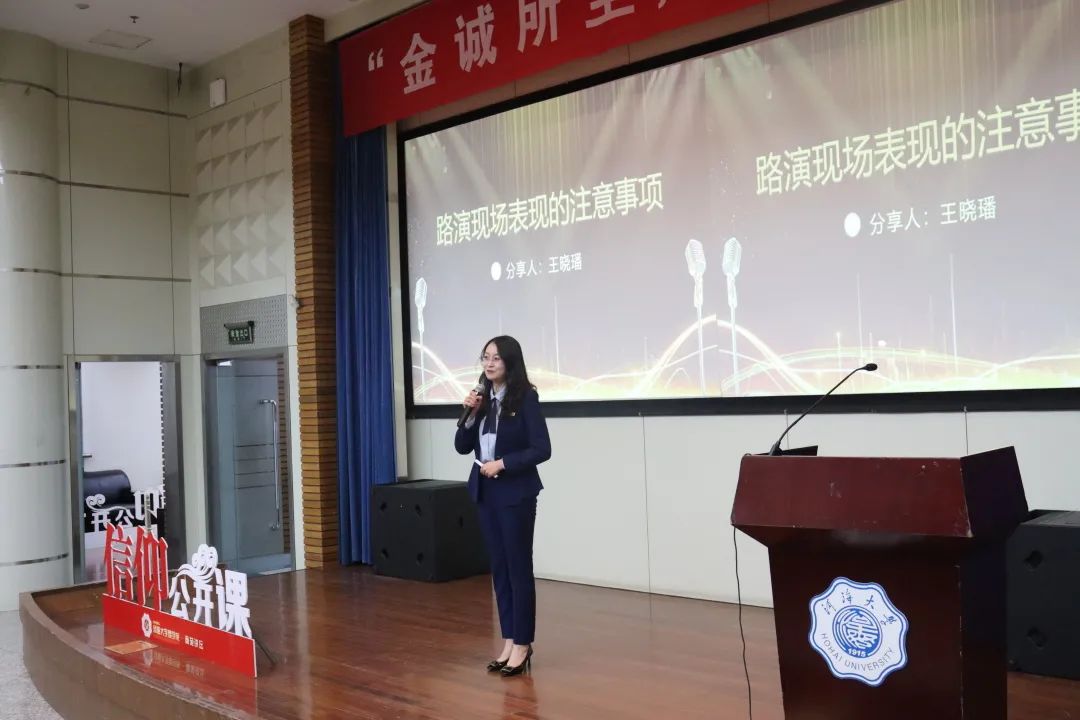 启动仪式第三项,在各大创新创业赛事以及商赛中取得优异成绩的同学进行现场路演与经验分享。第一位为同学们分享经验的是电影先生 MBA学生王晓璠,她所在团队的项目——“蓝鲸号”水下机器人在MBA创业大赛中获得全国八强的好成绩。曾获“互联网+”全国银奖的李沁如同学也为同学们带来了一场精彩的现场路演,李沁如团队的项目——“崇新数字”同样致力于解决市场痛点,这样一款基于“区块链+AI智能合约”的数字文化产品交易分发一站式平台具有“用户上传即存证确权,维权更便捷智能,定价有参考”等技术亮点,现已获百万天使投资,并与20余家企业进行了合作。曾获“挑战杯”“互联网+”省赛二等奖的梁岚同学分享了她所在团队的项目,该项目深耕国家政策,关注民生福祉,致力于解决渔民的民生难题。在三位同学讲解完创新创业赛事后,杜佩恒同学为同学们分享了他对ERP沙盘大赛的想法。最后,李林同学为同学们带来了危机公关大赛的经验分享。