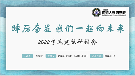 2021级工管二班班长李语千以“一起向未来”为主题,依托主题团日、主题班会、学习研讨等形式,设计分享了班级2022年度学风建设工作计划。2022年,班级将依照“明确目标,共同奋斗”、“集体活动,团结互助”、“召开班会,及时总结”的建设思路,营造“团结奋进、创新活泼、求真务实”的班级氛围,形成“勤学、好学、乐学”的良好学风。