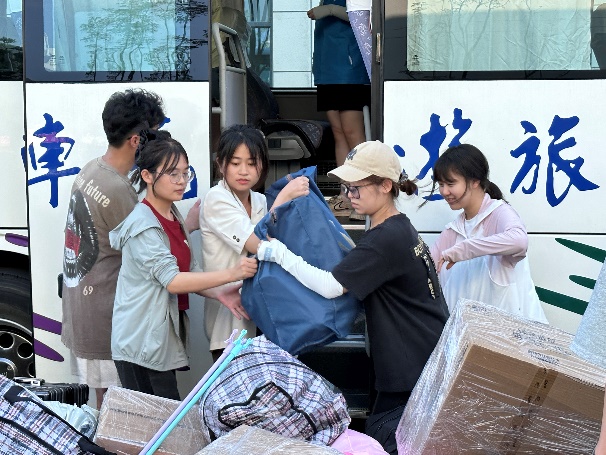 志愿服务,同心同行。学院三个校区的师生志愿者积极参与,通力合作。上车时,志愿者们为学生检查行李,协助运输装车,确保搬迁学生顺利上车。下车时,志愿者们引导学生有序下车,协助卸下行李,并将行李送至管理站内,确保现场秩序有条不紊。