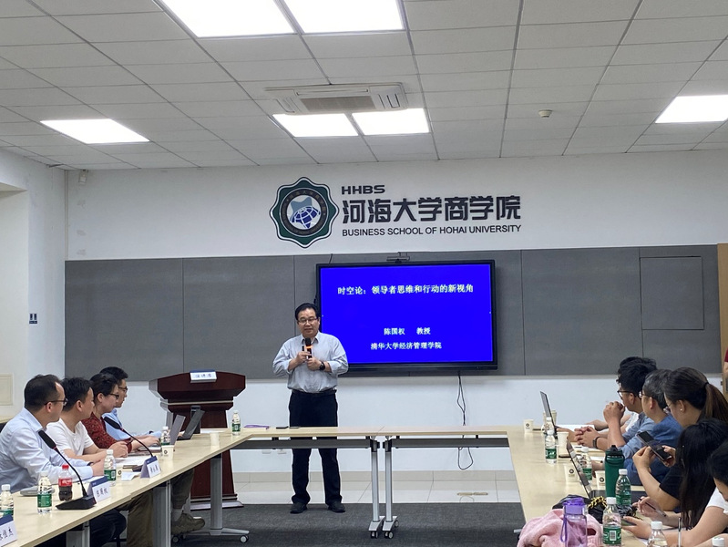 陈国权教授分别从“时空论的研究体系”、“时空论的思想”、“时空论的应用”三个层面进行了介绍。首先,陈教授从领导和管理的时空理论、时空领导力出发,介绍了时空论研究的发展逻辑和内容体系。其次,陈教授引经据典,从“商圣”范蠡到李嘉诚、任正非等企业家的案例,再到毛泽东的军事思想,深入浅出地阐述了时空论的深刻内涵和基本思想。接着,陈教授详细介绍了时空论在冲突、变革、沟通、心理咨询、战略分析、人才选拔和培养、组织博弈等多个领域的应用,充分展示了时空论的现实指导价值。此外,陈教授就时空论的缘起、时空论的量化度量、时空观念的培养和空间资源的累积,以及时空论在商业案例中的应用等问题,与师生们开展了深入的探讨与交流。
