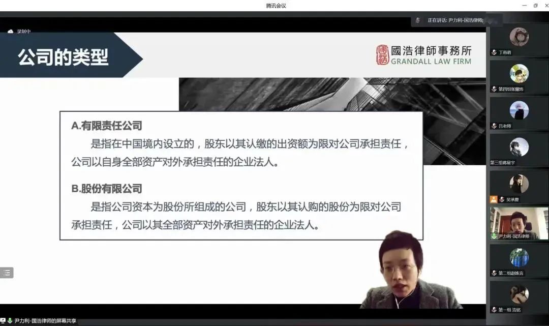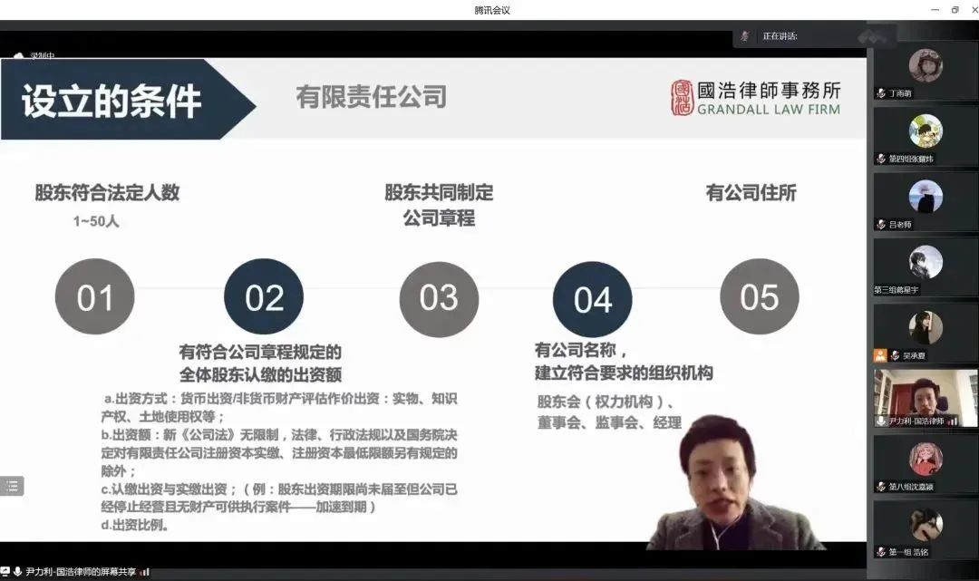 2022年11月15日,第六期青创沙龙于线上成功开展。本次讲座邀请到南京国浩律师事务所的合伙人尹力利律师为创新创业训练营的营员们带来分享。
