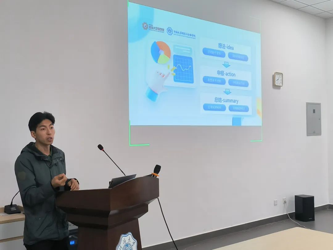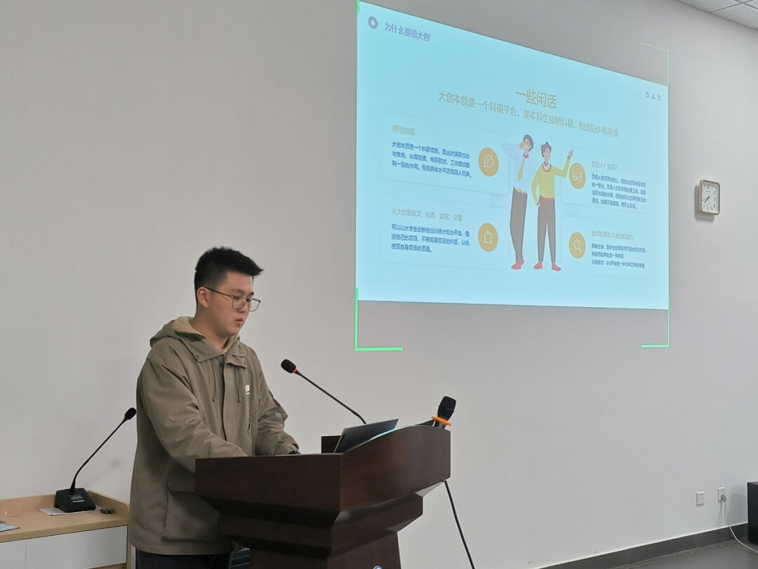 孙国轩同学结合自身丰富的实践经验,分享了如何将大创计划与社会实践紧密结合,以提升项目社会价值的多种路径,有效启发了同学们的创新思维,使学生对大创计划的灵活性和实践性有了更为深刻的理解和认识。