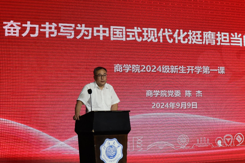 王腾老师作为新生班导师代表发言,满怀热情地向2024级新生们敞开怀抱,欢迎新同学加入充满活力的商院大家庭,他从大学生活的本质和特点的角度出发,鼓励同学们在大学阶段勇于探索,成为精彩大学生活的创造者、思考者、实践者。