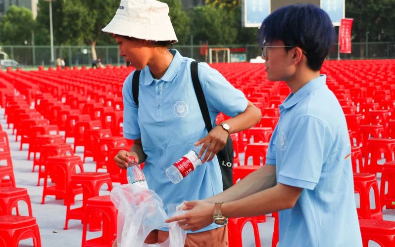 尽心尽力,团结奋进。下午16点,新同学们在顺利完成报到注册工作后,来到东操场与自己班级的助学导师集合,为开学典礼现场搬运矿泉水并给各座位分配矿泉水。虽然烈日炎炎,在学校各部门老师的指导下,从志愿者集合到分配工作,同学们秩序井然,认真听从负责老师安排,很快就投入到劳动之中,尽管大家第一次见面,但相互配合默契,团结协作。不论男生女生,大家活力十足,取水、搬水、摆水的工作有条不紊,不出一个小时大家就顺利完成了开学典礼现场矿泉水分配与家长席座位布置工作。在劳动中,新生们不仅体验到了团队合作的力量,更深刻理解了“劳动最光荣、奋斗最幸福”的深刻内涵。汗水浸湿了衣背,但他们的脸上却洋溢着满足与自豪的笑容。