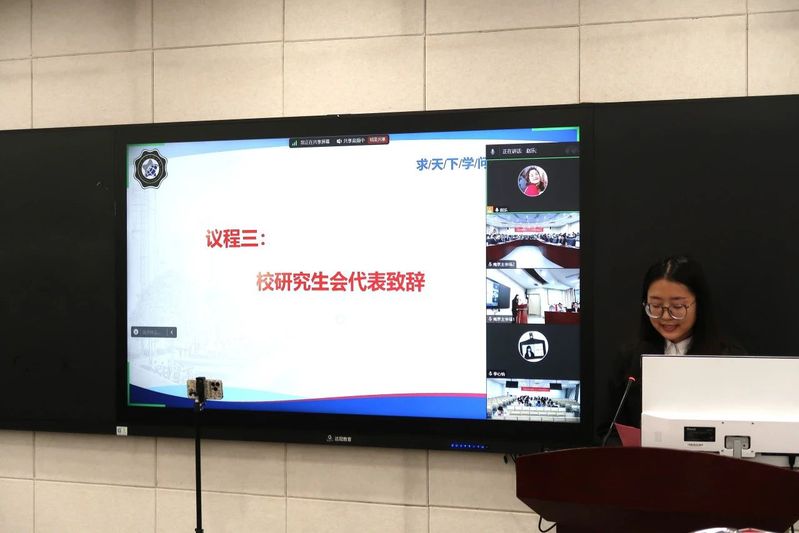 校研究生会代表田梦婷同学对大会的召开表示了热烈祝贺,充分肯定了电影先生 研究生会过去一年所取得的成绩,并对研究生会未来工作提出了期望。