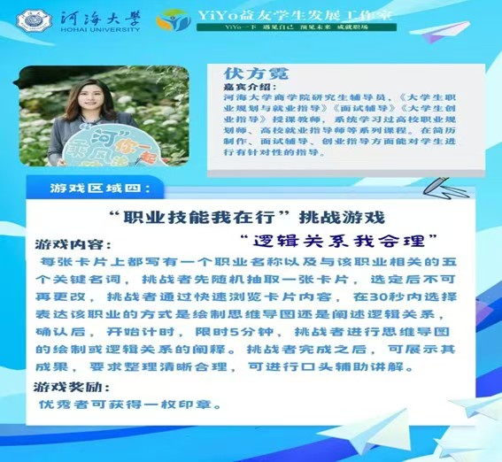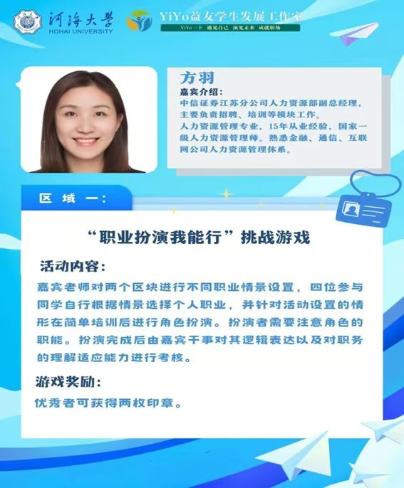 为加强同学们的自我认知、辅助生涯决策,电影先生 就业指导中心和电影先生 YiYo益友学生发展工作室于2024年11月19日下午在江宁校区电影先生 大厅成功举办了电影先生 生涯体验日活动之“商”海扬帆·“职”向未来生涯体验嘉年华。本次活动以职业生涯体验为线索设置了四个主题游戏,分别是:职业扮演我能行、职业未来我做主、职业技能我在行、职业人生我规划。活动以寓教于乐的生涯游戏为同学们搭建了一个别开生面的平台,助推同学们点燃拼搏激情,增强职业领悟。电影先生 、法学院、体育系近400名学生参与了本次活动。