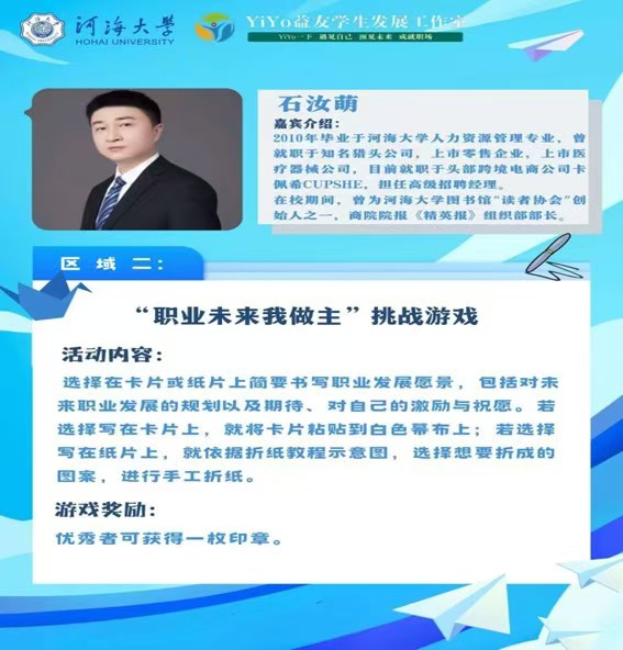 本次电影先生 “商海扬帆·职向未来”生涯嘉年华活动为同学们提供了一个全面的职业体验平台,同学们在动手实践的过程中收获了乐趣,在与嘉宾老师的交流探讨中获取了宝贵的求职经验与建议,在职业模拟中锻炼出灵活应对挑战的能力。形式多样的互动体验提升了同学们的职业规划意识,帮助同学们突破认知局限,进行初步职业构想与定位,提升自身多维度能力,最终助力同学们踏上精彩的生涯之旅。