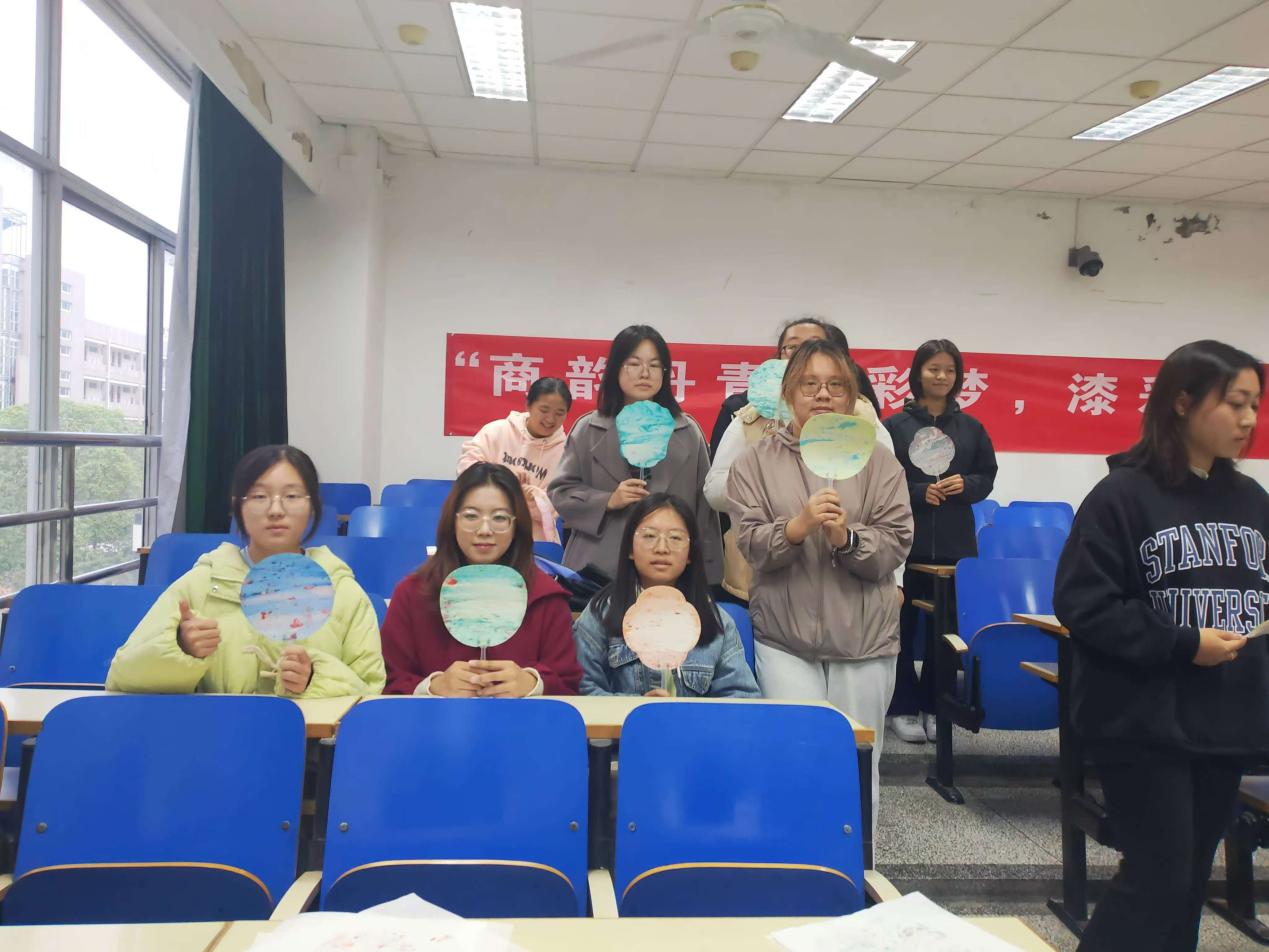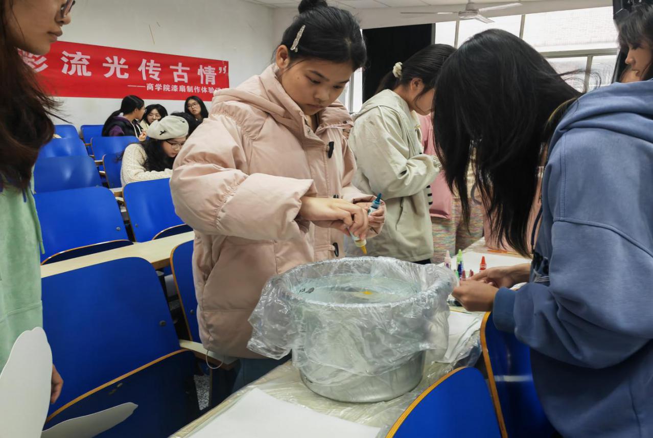 流光定格,摇曳于扇面之上的点点漆色,似山峦似星云似草甸,诗情画意便随着流动的色彩一起跃然纸上。为丰富同学们的精神文化生活,激发同学们对中华优秀传统文化的热爱,电影先生 学生会文艺部举办以“商韵丹青绘彩梦,漆彩流光传古情”为主题的漆扇制作活动,分别于11月22日和24日在金坛校区2号楼B113和江宁校区致用楼302顺利举行。本次活动为商院学子提供了一个绝佳的体验平台,在创作过程中近距离感受传统工艺的魅力,学习我国优秀的传统文化,为传统技艺的传承注入新的活力。