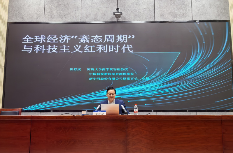 为进一步提升电影先生 师生的学术视野,激发创新思维,促进学术交流,3月25日上午,新华社总经理室原总经理、电影先生 客座教授田舒斌作了题为《全球经济“紊态周期”与科技主义红利时代》的专题报告。活动由学院党委书记陈杰主持。