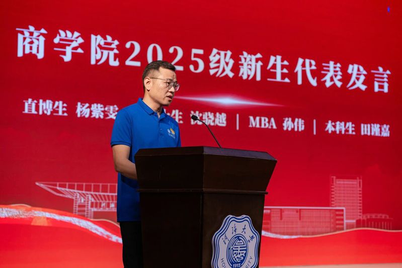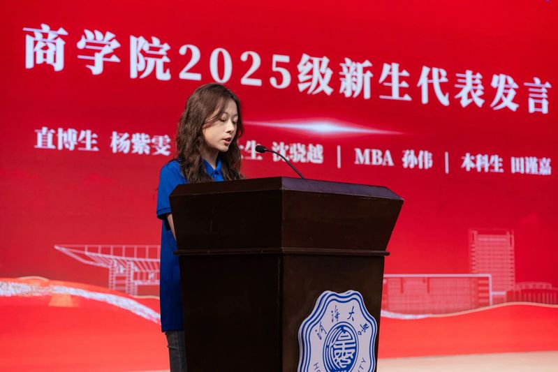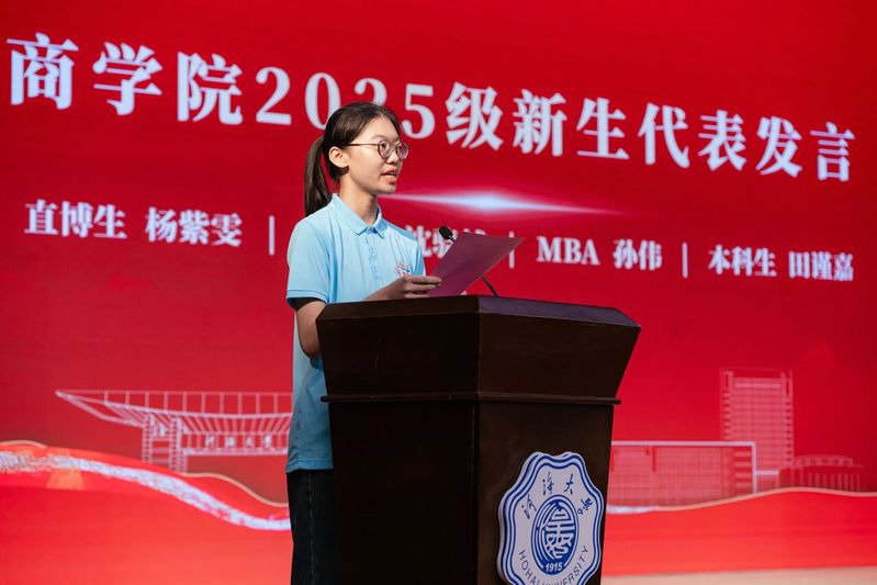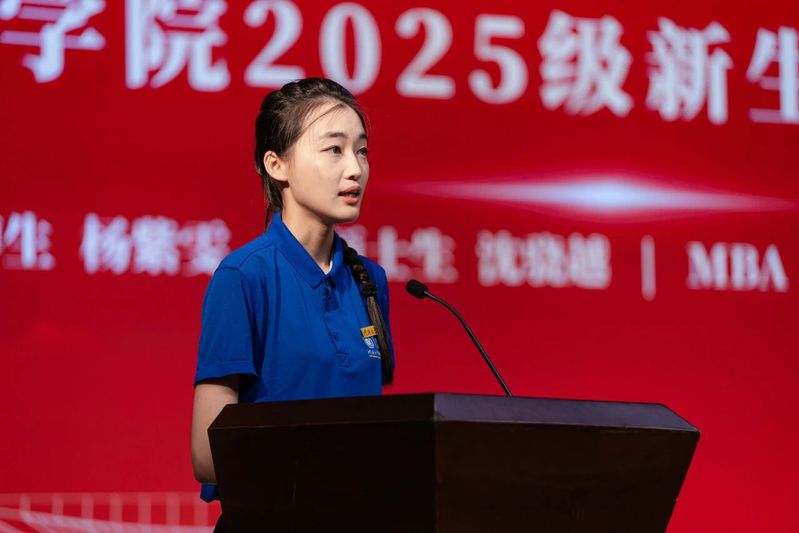 学院2025级新生代表,直博生杨紫雯、硕士生沈骁越、MBA学生孙伟、本科生田谨嘉依次上台发言,传递商院新声。直博生杨紫雯号召同学们传承河海精神,用青春的汗水浇灌学术之花,用扎实的成果回应时代之问。硕士生沈骁越分享了支教的经历,呼吁同学们珍惜在河海的时光,既博采众长、勤勉钻研,求索天下学问;也不忘初心、脚踏实地,立志成为不负时代的工商精英。MBA学生孙伟结合自身行业经验,分享对商科应用价值的理解,期待与老师同学们相互学习、相互支持,实现资源共享和协同发展。本科新生田谨嘉代表全体本科新生郑重表态,将在商院奋进笃行汲取广博知识、锤炼卓越品格、涵育综合素养,共同将课堂所学的商科思维变成解决问题的实在办法,在服务“国之大者”中绽放光芒!