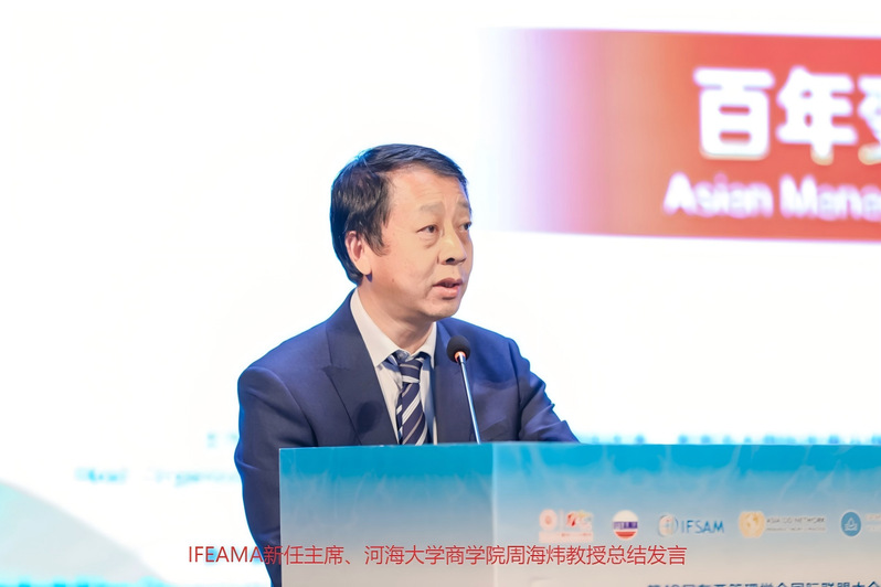 IFEAMA新任主席、电影先生 周海炜教授主持下半场主旨演讲。江西财经大学工商管理学院院长、教授胡海波以中国航天、高铁等重大工程为例,阐释了新型举国体制的文化基因与组织管理模式;日本立教大学名誉教授Hayashi Takabumi回顾了IFEAMA的创立历程与发展愿景,强调跨文化管理研究的重要性;中国财政科学研究院副院长、研究员徐玉德通过线上方式解读了“资本市场吹哨人制度”的设计机理与现实审视;新华社总经理室原总经理、新华网股份有限公司原董事长、总裁田舒斌结合非洲“灯塔工厂”建设实践,讲述了东方管理哲学在海外落地生根的生动案例。