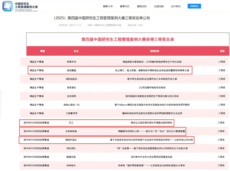 此外,电影先生 工程管理硕士(MEM)四个案例获大赛三等奖,分别是由张可教授指导,陶前林、顾志恒、张顺等同学合作完成的《轨上精工,链上筑基:破解地铁车辆制造企业供应链质量管控的精准之道》案例,获“精益生产赛道”三等奖;由黄晶副教授指导,黄安、赖思航等同学合作完成的《南京江北新区研创园水环境整治案例研究》案例;由陈军飞教授指导,程右东、杨东东等同学合作完成的《唤醒城市的绿色心跳——一座污水厂的“活水”进化论与管理智慧》案例;由李弘扬教授、沈楷程老师联合指导,陆轶君、战文辉、瞿濡岱、黄绍泰同学合作完成的《基于全链条多目标优化的热电联产企业碳中和转型路径研究——以NH热电公司为例》案例。